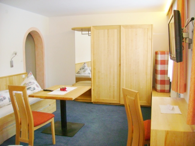 Unser zweites grosses Dreibettzimmer, welches mit neuen hellen Erle-Vollholzmöbeln ausgestattet wurde.Die Couch ist in ein drittes Bett umbaubar. Man geniesst hier die Nachmittags- und Abendsonne. Der Blick richtet sich also nach Westen, Richtung Dorf und Pölven. Falls ein Baby oder Kleinkind mitreist, stellen wir gerne ein Reisegitterbett auf.