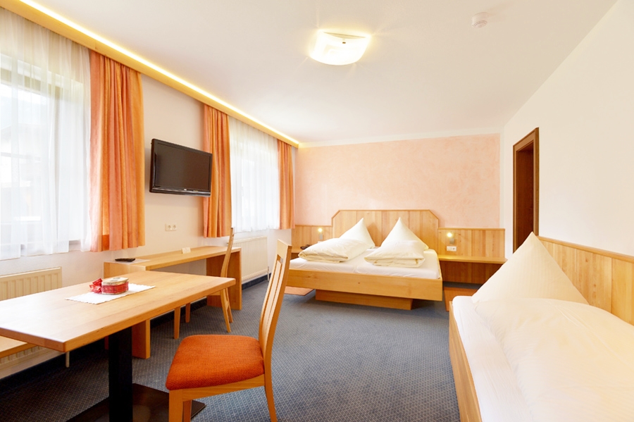 Unser zweites grosses Dreibettzimmer, welches mit neuen hellen Erle-Vollholzmöbeln ausgestattet wurde.Die Couch ist in ein drittes Bett umbaubar. Man geniesst hier die Nachmittags- und Abendsonne. Der Blick richtet sich also nach Westen, Richtung Dorf und Pölven. Falls ein Baby oder Kleinkind mitreist, stellen wir gerne ein Reisegitterbett auf.